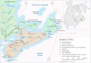 King George's War (1744–1748) is the name given to the military operations in North America that formed part of the War of the Austrian Succession (1740–1748). It was the third of the four French and Indian Wars. It took place primarily in the British provinces of New York, Massachusetts Bay (which included Maine as well as Massachusetts at the time), New Hampshire (which included Vermont at the time), and Nova Scotia. Its most significant action was an expedition organized by Massachusetts Governor William Shirley that besieged and ultimately captured the French fortress of Louisbourg, on Cape Breton Island in Nova Scotia, in 1745. In French, it is known as the Troisième Guerre Intercoloniale or Third Intercolonial War.[1]