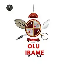 | Irame | Unknown - 1550 (aged 40+) | 1538 | 1550 | 3rd Olu. He succeeded his brother. It is stated that he banished the three gods (Ibirikimo, Otueke, and Ike) and their worshipers from Ode-Itsekiri-Olu (Big Warri) because of their incessant noise-making". The gods and their worshipers moved to Orugbo which is a community about 3 km from Ode-Itsekiri-Olu. | Itsekiri | [[File:![]() Olu Irame First Of Name |