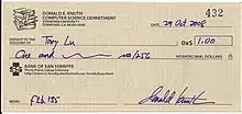 As of October 2001, Knuth reported having written more than 2,000 checks, with an average value exceeding $8 per check.[3] By March 2005, the total value of the checks signed by Knuth was over $20,000.[4] Very few of these checks were actually cashed, even the largest ones. More often they have been framed and kept as "bragging rights".[5][6]
