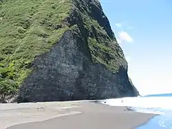 The volcano stayed active well into the formation of these mountainside valleys, as illustrated by later Pololu lava flows, which covered the north and northwestern end of Kohala volcano and often flowed into Pololu Valley. Recent seafloor mapping seems to show that the valley extends a short way beyond the seashore, then terminates at what may be the headwall of the great landslide found off the northeast coast of Kohala.[3]