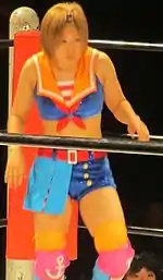 Konami debuted for World Wonder Ring Stardom on December 22, 2016, defeating Hiromi Mimura, and confirmed she would be competing for the promotion regularly.[3][18] She was pushed as a strong contender despite being a newcomer, wrestling in competitive matches against established wrestlers like Toni Storm, Io Shirai and Yoko Bito. She began a feud with Kairi Hojo, and unsuccessfully challenged for the Wonder of Stardom Championship on March 26, 2017.[19] After losing to Hojo, the two formed an alliance, and teamed with Hiromi Mimura to win the Artist of Stardom Championship on May 6, 2017, giving Konami her first ever championship.[20] They lost the titles less than a month later to Queen's Quest.[21] Konami entered her first 5 Star Grand Prix in August but struggled greatly, losing all but one of her matches, defeating Mandy Leon on the final day. At Mask Fiesta 2017 on October 29, Konami, under the ring name Masked Wan-chan, donned a mask and teamed up with Aloha Bito and Shout Woman in a loss to Chupa Panda, Iotica and Mini Iotica.[22]