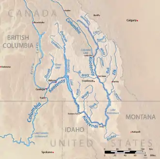 - ↑ The usage of the term "Canadian portion of the Columbia Basin" in this article denotes any parts of the Columbia River watershed that drain to the Columbia upstream of where it crosses the Canada-US border, regardless if the tributary passes through the United States as well (such as the Kootenay). Under this usage, for example, the Kootenay, which originates in Canada, flows back to the US, and returns to Canada, is considered part of the "Canadian portion", whereas the Okanogan River, which begins in Canada but joins the Columbia in the US, is not part of the "Canadian portion". The Clark Fork-Pend Oreille system, whose watershed is almost entirely within the United States, is considered part of the "Canadian portion" because the Pend Oreille meets the Columbia just north of the border.