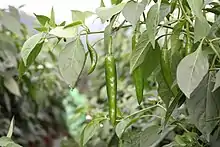 Korean chili peppers or Korean hot peppers, also known as Korean red,[1] Korean dark green,[2] or Korean long green[3] peppers according to color (ripening stages), are medium-sized chili peppers of the species Capsicum annuum. The chili pepper is long, slender and mild in flavor and spice. Green (unripe) chili peppers measure around 1,500 Scoville heat units.[4]