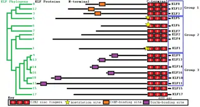 - 1 2 3 Presnell JS, Schnitzler CE, Browne WE (July 2015). "KLF/SP Transcription Factor Family Evolution: Expansion, Diversification, and Innovation in Eukaryotes". Genome Biology and Evolution. 7 (8): 2289–309. doi:10.1093/gbe/evv141. PMC 4558859. PMID 26232396.