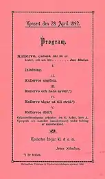 Kullervo premiered on 28 April 1892 at a sold-out concert audience in the Ceremonial Hall of the Imperial Alexander's University of Finland, Sibelius—initially pale and trembling—conducting. The soloists were the Finnish mezzo-soprano Emmy Achté and baritone Abraham Ojanperä.[8] The audience—a mix of the regular concert-going public and patriots there for the nationalist spectacle[8]—received two leaflets: first, a Swedish-language program that described Kullervo as a "symphonic poem" ("symfonisk dikt"); and second, text in Finnish, (with a Swedish translation) from The Kalevala for Movements III and V, as well as a motto that helped it to contextualize the instrumental Movement IV.[10] Notably, this was the first time in history that a concert audience had been given a Finnish-language text.[11] Although the orchestra overpowered Ojanperä and Achté,[8] the performance was a success: enthusiastic applause erupted after each movement and, at the end, Kajanus presented Sibelius with a blue-and-white-ribboned laurel wreath that quoted prophetically lines 615–616 of Runo L of The Kalevala: "That way now will run the future / On the new course, cleared and ready".[12] The next day, Kullervo received its second performance—again under Sibelius's baton—at a matinée concert, and on 30 April, Kajanus conducted the fourth movement at a popular concert that concluded the season.[13][9][lower-alpha 3]