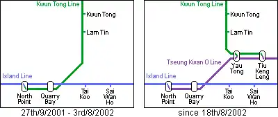 As part of a project to reduce congestion at Quarry Bay, the Kwun Tong line was briefly extended to North Point on 27 September 2001. This station did not last as the terminus for long, as the newly built Tseung Kwan O line would take over the cross-harbour portion of the route in 2002. On 18 August 2002, The Kwun Tong line was extended to Tiu Keng Leng its present eastern terminus, coinciding with the opening of the Tseung Kwan O line.