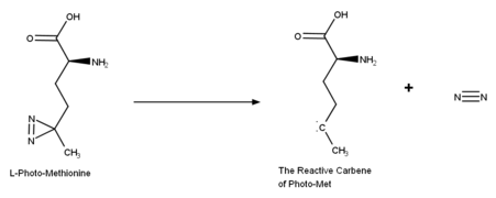 Because the previous synthesis had worked, photo-methionine is photo-reactive due to the diazirine ring. Once this ring has become exposed to UV light, nitrogen leaves as nitrogen gas (N2) and forms the highly reactive intermediate carbene.[1] Photo-activation of amino acids provide the ability of photo-cross-linking in proteins.[1] This type of cross-linking has three major advantages; there is greater specificity for this cross linking due to the short lived intermediates and that this amino acid is functional, and most importantly; not toxic (meaning it should not disrupt the protein's function or structure dramatically).[1] Research had found that this activation is the rate-limiting step; not the cross-linkage.[2]