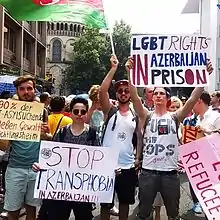 Homosexuality remains a taboo subject in the Azerbaijani society, as each year since 2015, ILGA-Europe has ranked Azerbaijan as the worst state (49 out of 49) in Europe for LGBTQIA+ rights protection, citing "a near total absence of legal protection" for LGBTQIA+ individuals.[3] In September 2017, reports emerged that at least 100 members of Baku's LGBTQIA+ community were arrested, ostensibly as part of a crackdown on prostitution. Activists reported that these detainees were subject to beatings, interrogation, forced medical examinations and blackmail.[4][5][6]