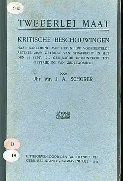 .louiscouperus (2003).nl - Jacob Schorer. Tweeërlei maat: Kritische beschouwingen naar aanleiding van het nieuw voorgestelde artikel 248bis wetboek van strafrecht in het den 16 sept. 1910 gewijzigde wetsontwerp ter bestrijding tot bestrijding van zedeloosheid. The Hague 1911.