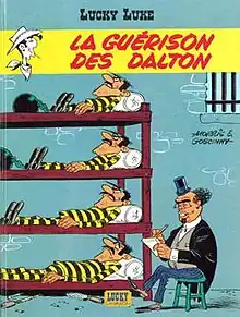 La Guérison des Dalton is a Lucky Luke adventure written by Goscinny and illustrated by Morris. It is the forty fourth book in the series and It was originally published in French in the year 1975 and in English by Cinebook in 2010 as A Cure for the Daltons.