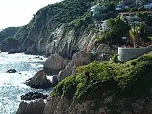 La Quebrada (Spanish for "gulch" or "ravine") is one of the most famous tourist attractions in Acapulco, Mexico. Divers entertain tourists by jumping off either of two ledges on the cliff, one that is 40 feet (12 m) high and the top one which is 80 feet (24 m) high. The divers must calculate the right moment to jump to catch an incoming wave and avoid serious injury or death. Occasionally jumpers dive with a torch. Most of the divers come from the family of Quebrada divers. Although cliff diving at La Quebrada had taken place for many years, it was not until 1934 that the La Quebrada Cliff Divers was formed.[1]
