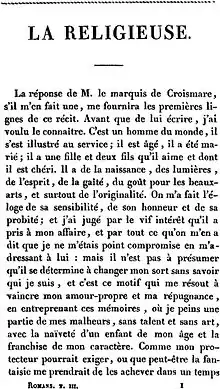 The novel began not as a work for literary consumption, but as an elaborate practical joke aimed at luring the Marquis de Croismare, a companion of Diderot's, back to Paris. The novel consists of a series of letters purporting to be from a nun, Suzanne, who implores the Marquis to help her renounce her vows, and describes her intolerable life in the convent to which she has been committed against her will.[1][2]