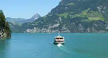 The Urnersee occupies the northernmost and deep portion of the great cleft of the Reuss Valley, which has cut through the Alpine ranges from the St Gotthard Pass to the neighbourhood of Schwyz. From its eastern shore the mountains rise in almost bare walls of rock to a height of from 3,000 to 4,000 ft (910 to 1,220 m) above the water. The two highest summits are the Fronalpstock and the Rophaien (2078 m). Between them the steep glen or ravine of the Riemenstaldener Tal descends to Sisikon, the only village with Flüelen right on the shore on that side of the Urnersee. On the opposite or western shore, the mountains attain still greater dimensions. The Niederbauen Chulm is succeeded by the Oberbauenstock, and farther south, above the ridge of the Scharti, appear the snowy peaks of the Gitschen and the Uri Rotstock (2,928 m). In the centre opens the Reuss Valley, backed by the rugged summits of the Urner and Glarner Alps.[4]