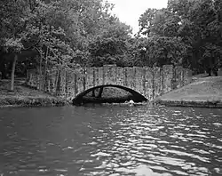 The Lakeshore Drive Bridge carries a closed-off portion of Lakeshore Drive across a tributary stream on the west side of Lake Number 3 in North Little Rock, Arkansas. It is a stone arch bridge with closed spandrels and a total structure length of 53 feet (16 m). The bridge consists of a single elliptical curved arch, which spans 20 feet (6.1 m) and is 5 feet (1.5 m) high. Rustic square stone columns rise from the spandrels, creating uneven parapets on the sides of the structure. The bridge was built in the late 1930s along with Edgemere Street Bridge as part of developer Justin Matthews' construction of the Lakewood area. It is one of a small number of documented masonry arch bridges in the state.[2]