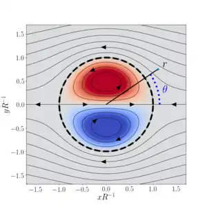 The Lamb–Chaplygin dipole model is a mathematical description for a particular inviscid and steady dipolar vortex flow. It is a non-trivial solution to the two-dimensional Euler equations. The model is named after Horace Lamb and Sergey Alexeyevich Chaplygin, who independently discovered this flow structure.[1] This dipole is the two-dimensional analogue of Hill's spherical vortex.