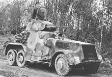 The L-182 was bought for testing[7] in 1936, it was used by the armored unit of the Ratsuväkiprikaati (English: Cavalry Brigade) and saw limited service in the Winter War. Next, the armored unit of 1. Divisioona (English: 1st Division) employed it, in the Continuation War in 1941, already with the original 13.2 mm L-35/36 machine gun replaced by the 20 mm L-39 anti-tank rifle, conversion made approximately in December 1940. It seems that the armored car was out of service in late 1941 and was scrapped in 1945.[6]