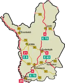 Three European roads pass through Lapland: E8, E63 and E75, the latter of which runs almost 600 kilometres from the southernmost municipality of Simo to the northernmost municipality of Utsjoki.[37]