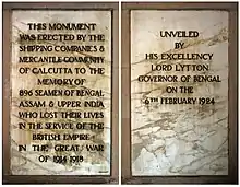 The Lascar War Memorial was erected by shipping and mercantile companies, in the memory of the 896 Lascars of undivided Bengal and Assam who lost their lives during World War I.[5] The monument is situated at the southern end of the Maidan, on Naiper Road, Hastings, near Prinsep Ghat. The 100 feet high monument was unveiled by Lord Lytton, then Governor of Bengal on 6 February 1924. The monument, built in typical Oriental style, is a four-sided column, having designs reflecting the prow of an ancient galley on each side of the column. The upper part of the monument consists of four small minarets and a large gilt dome. A typical Indian look has been given by adding wavy lines beneath the projected balcony, which symbolises waves, along with chhajjas and trellises.[3] The Lascar War Memorial has similarities with the victory tower of Chittor.[1] The memorial built in the Indo-Mughal style by William Ingram Keir, who also designed the Kidderpore Bridge, buildings at Bengal Engineering and Science University in Shibpur, the Indian Institute of Technology, Kharagpur, and Islamia College, and also replaced the 1934 earthquake affected spire of St. Paul's Cathedral, Kolkata with a tower. William Ingram Keir won a prize of Rupees 500 for designing the memorial.[2] The inside of the Memorial is approached through a huge doorway on the Northern wall. The interior contains three plaques below the inscription "Lascar Memorial." One plaque commemorates the unveiling of the memorial by Lytton. The second plaques says that the memorial was erected by shipping and mercantile community of India in memory of the 896 seamen of Bengal Assam and upper India (the term Lascar is not used) who lost their lives in service of the British Empire in the great war of 1914 – 18. The third smaller plaques tells about the renovation and lighting of the Lascar War Memorial.