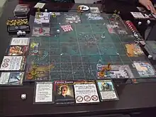 Last Night on Earth: The Zombie Game is a survival horror board game that was first published in 2007. Players can play on the Hero team or as the Zombies. A modular board randomly determines the layout of the town at the start of each game and there are several different scenarios to play.[1] Seven supplements have been released.