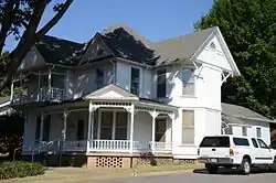 The Lattimer House is a historic house at Oak and Market Streets in Searcy, Arkansas. It is a two-story wood-frame structure, with a hip roof, and a variety of projecting gables and porches typical of the Queen Anne style. The upper level is clad in diamond-cut wooden shingles. A wraparound porch on the ground floor has delicately turned posts and balusters, while a projecting second-story porch has a heavier Stick-style balustrade and cornice. The house was built about 1895, and is one of Searcy's finest examples of the Queen Anne style.[2]