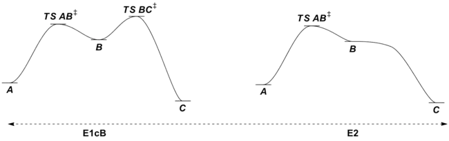 This dramatic departure from normal leaving group requirements occurs mostly in the realm of C=O double bond formation where formation of the very strong C=O double bond can drive otherwise unfavorable reactions forward. The requirement for a good leaving group is still relaxed in the case of C=C bond formation via E1cB mechanisms, but because of the relative weakness of the C=C double bond, the reaction still exhibits some leaving group sensitivity. Notably, changing the leaving group's identity (and willingness to leave) can change the nature of the mechanism in elimination reactions. With poor leaving groups, the E1cB mechanism is favored, but as the leaving group's ability changes, the reaction shifts from having a rate determining loss of leaving group from carbanionic intermediate B via TS BC through having a rate determining deprotonation step via TS AB (not pictured) to a concerted E2 elimination. In the latter situation, the leaving group X has become good enough that the former transition state connecting intermediates B and C has become lower in energy than B, which is no longer a stationary point on the potential energy surface for the reaction. Because only one transition state connects starting material A and product C, the reaction is now concerted (albeit very asynchronous in the pictured case) due to the increase in leaving group ability of X.
