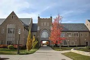 Built in 1953, O'Shaughnessy Hall is the main center of the Notre Dame College of Arts and Letters, hosting classrooms, art galleries, a coffee shop, and administrative offices. It was built in 1953 by Ellerbe Associates in collegiate Gothic style. Its Great Hall features a crucifix by Croatian sculptor Ivan Meštrović, a bust of Dean Charles E. Sheedy, and 7 stained glass windows, representing the seven liberal arts.[39] The Great Hall also hosts two tapestries that were rediscovered and restored in 2014 when the Hall was restored to its original appearance. One tapestry is of German or Belgian production from the 17th century, while the other one is from 18th century France.[40] It was featured in the movie Rudy.[41] The departments of Art and Art History, and Design is housed in the Leo and Edna Riley Hall of Art & Design. The building, which built in 1917 as a chemistry hall, was renovated in 1982 thanks to a donation from Allan Riley, real estate investor and 1957 graduate.[42] The department also houses its graphic and industrial design programs in the recently renovated West Lake hall.[43][44] The Departments of Philosophy and Theology are housed in Malloy Hall.[45]