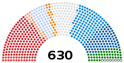 The number of elected deputies is 630. At the end of the legislature, eight seats remained vacant making the final total number of deputies 622. For these seats no by-election was planned, since they were left vacant less than a year before the natural end of the legislature.