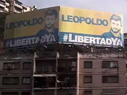 During the crisis in Venezuela, he called for protests in February 2014.[11] He was arrested on 18 February 2014 and charged with arson and conspiracy; murder and terrorism charges were dropped. Human rights groups expressed concern that the charges were politically motivated.[12][13] His imprisonment in Ramo Verde was controversial; the UN High Commissioner for Human Rights called for the release of those arrested in connection with the protests.[14][15] Opinion polls in late 2014 showed that López had become one of the most popular politicians in Venezuela following his arrest.[16] In September 2015, he was found guilty of public incitement to violence through supposed subliminal messages, being involved with criminal association, and was sentenced to 13 years and 9 months in prison.[17][18]