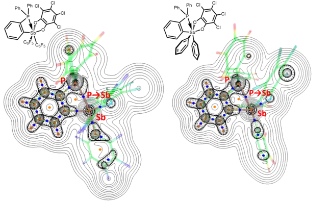 Introduction of electron-withdrawing substituents on antimony results in increased acidity. For example, intramolecular donor–acceptor interactions of two stiboranes, o-C6H4(PPh2)[SbPh2(O2C6Cl4)] and o-C6H4(PPh2)[Sb(C6F5)2(O2C6Cl4)], have been analyzed by AIM. AIM analysis of electron density at the bond critical point (bcp) and delocalization index indicates that electron-withdrawing substituents on Sb(V) lead to an increased P–Sb bonding covalency.[17]