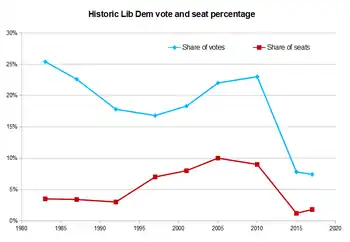 Heading into the 2019 general election, the party polled well, with one poll showing the party with 20% (within 4% of Labour) as late as 28 October.[146] Nonetheless, during the campaign period the party's fortunes dwindled, and leader Jo Swinson received negative reviews.[147][148] In the election, the Liberal Democrats lost ten seats from the previous parliament and one from the previous election, returning 11 MPs. Of the nine new MPs who joined between June and October 2019, the eight who contested their seats in the 2019 general election all lost their seats. However, the party did gain 4.2% in the vote, rising to 11.6%. Swinson herself narrowly lost her East Dunbartonshire constituency to the Scottish National Party's Amy Callaghan, forcing her to resign as leader the next day in accordance with the Liberal Democrat Constitution which mandates that the leader must also serve as an MP.[149] Deputy Leader Ed Davey and Party President Sal Brinton then jointly assumed the positions of acting co-leaders of the party. Brinton was at the end of the year (31 December 2019) replaced by Mark Pack as Party President and acting co-leader[150] while Mike Dixon remains the party CEO.[151]