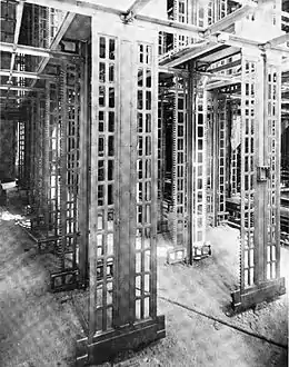 The stacks frame­work (visible within unfinished walls in this Decem­ber 1913 view) of Harvard's Harry Elkins Widener Memorial Library sup­ports the roof and top­most level of offices and special col­lec­tions[2] as well as shelves holding 3 mil­lion volumes.