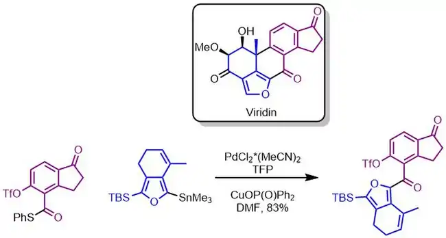 The Guerrero lab used the Liebeskind–Srogl coupling to construct the entire carbon skeleton of viridin in high yield on multi-gram scale.[13]