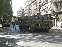 As a result, Spain negotiated with Germany over the procurement and local production of many Leopard 2A5s;[27] a Memorandum of Understanding was signed between the two in 1995, and the Germans lent 108 Leopard 2A4s to the Spanish Army for five years starting in 1998.[28] In 2005, the Spanish Ministry of Defense declared intention to buy the tanks instead of renting them.[29] The local production terms in the Memorandum allowed Santa Bárbara Sistemas to start producing Leopard 2Es in 2003, and the first platoon of tanks was delivered in December 2003.[30] In comparison to the smaller Lince, the Leopard 2A4 weighs 55 t (61 short tons) and is powered by a 1,500 hp (1,100 kW) diesel engine.[31] The greater weight of the Leopard 2A4 is due in part to its thicker armor, affording greater protection and balancing out the loss in mobility as compared to the Lince.[6][32]
