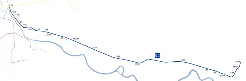 Line 9 is a rapid transit line of the Tianjin Metro. It spans 52.8 km (32.8 mi) with 21 stations, connecting the urban area of Tianjin with Binhai New Area, a new area within the jurisdiction of Tianjin Municipality. The one-way journey time is approximately one hour.