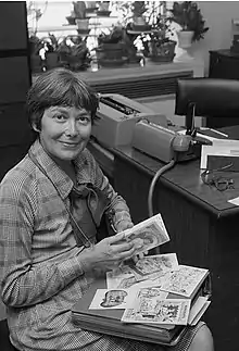 ![]() Taylor inspecting samples of antique advertising art, 1979. | |