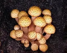 Armillaria is a genus of fungi commonly known as honey mushrooms. First treated by Elias Magnus Fries in 1821, and later assigned generic rank by Friedrich Staude in 1857,[1] Armillaria is classified in the family Physalacriaceae of the Agaricales, the gilled mushrooms.[2] The majority of species in Armillaria are saprotrophic and live mainly on dead wood, but some are parasites that can cause root and butt rot in over 600 species of woody plants.[3] Some Armillaria species form mycorrhizae with orchids;[4] others, such as A. gallica, A. mellea, and A. tabescens, are bioluminescent.[5]