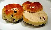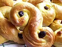 • Bolle – a small wheat bun pastry with usually a round top and flat bottom that contains wheat flour, sugar, yeast, eggs, milk, water and often also cardamom and hornsalt. Buns can be served whole or split in half with butter and toppings as a dessert, a snack or often as an accompaniment to coffee. They often contain raisins (rosinbolle) or chocolate (sjokoladebolle).[3]