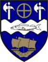 The arms of Ballina, County Mayo, adopted in 1970, include an image of "St Patrick's cross" carved on a rock in Leigue cemetery, said to date from Patrick's visit there in AD 441.[25]
