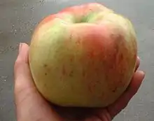 Arthur W. Barnes[6] Chester, England Raised 1902, introduced 1928 Parentage Gascoyne's Scarlet x Cox Orange. A yellow apple with red flush. Width 82 mm (3.2 in), height 70 mm (2.8 in). Stalk medium. Flesh is white, firm, fine textured, very juicy, acid. Cooking PickE mid- to late September; use November–March
