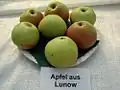 Adersleber Calville (cs. Kalvil aderslebenský)[15][3][16][7] Saxony, Germany 1830–1840 A green apple with red flush. Width 72 mm (2.8 in), height 58 mm (2.3 in). Stalk 16 mm (0.63 in). Parentage Calville blanc d'Hiver x Alexander. Flesh; aromatic, subacid to sweet. VitC 10. Cold Storage 0oC 150 days. Eating PickE mid-September. PickG mid–late October. Use November–January.