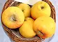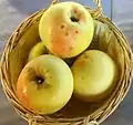 Ananas Reinette(cs. Ananasová reneta, de. Ananas Renette, fr. Reinette ananas, pl. Reneta Ananasowa, ru. Ananasnîi renet)[3][23][36][14][15][34][16] Netherlands Before 1800 A small yellow apple with pineapple flavor. Width 48–65 mm (1.9–2.6 in), height 52–65 mm (2.0–2.6 in). Weight 115 g (4.1 oz). Stalk 11–20 mm (0.43–0.79 in). Flesh is crisp, juicy, aromatic, acid. VitC 21. Eating, juice PickE early October. PickG mid- to late October. Use December–February