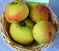 Adams Pearmain[13][6][8][14][12] Norfolk or Herefordshire, England Introduced 1826 A dessert apple. First introduced under the name "Norfolk Pippin". Width 64 mm (2.5 in), height 63 mm (2.5 in). Cells obovate, abaxile. Flesh pale yellow, crisp,fine-textured, firm, juicy, subacid, aromatic, very good. Eating PickE early- to mid-October.