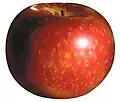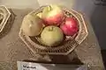 Aroma[24] Balsgård, Fjälkestad, Sweden 1947, Introduced 1973. A yellow apple with red flush. Width 63 mm (2.5 in), height 58 mm (2.3 in). Parentage Ingrid Marie x Filippa. Eating PickE early October. Use November–December