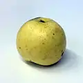 American Golden Russet (a.k.a. Golden Russet, Sheep Nose, Bullock's Pippin, Little Pearmain)[11][26] US Late 1700s Yellow with brown overcolour and grey russet. Width 64–74 mm (2.5–2.9 in), height 58–72 mm (2.3–2.8 in). Stalk 13–23 mm (0.51–0.91 in). Flesh is yellowish, tender, juicy sugary, lightly aromatic, best. Eating PickE early to mid-October. Use October–January