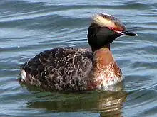 Grebes are small to medium-large freshwater diving birds. They have lobed toes and are excellent swimmers and divers. However, they have their feet placed far back on the body, making them quite ungainly on land.