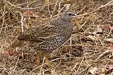 Bustards are large terrestrial birds mainly associated with dry open country and steppes in the Old World. They are omnivorous and nest on the ground. They walk steadily on strong legs and big toes, pecking for food as they go. They have long broad wings with "fingered" wingtips and striking patterns in flight. Many have interesting mating displays.