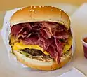 | Pastrami burger | ![]() | Popularized by Crown Burgers of Utah in 1978. | A burger with cheese and thin-sliced pastrami on top,[10] commonly served at Greek burger restaurants in Utah.[33] |