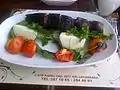 Beykoz kebabı Tomato and onion flavoured lamb, wrapped in aubergine slices and garnished with lamb brains[40]