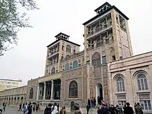 Before his visit to Europe, Naser al-Din Shah Qajar, the fourth king of Qajar dynasty, was thinking of building a mansion in his capital to compete with Isfahan’s Ālī Qāpū. A tall building that he could stand on its roof and see the entire Tehran. By his order, Shams-ol-Emareh building was started in 1865 and was finished in two years. Naser al-Din Shah took his guests to the roof of this building to see the capital. Building's designer was Moayer al Mamalek and the architecture was Ali Mohammed Kashi. The style of this building is a combination of traditional Iranian and Western architecture.[20] |