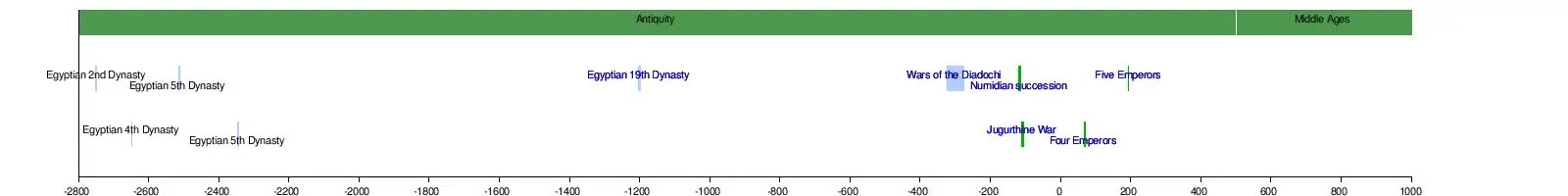 - Numidian war of succession (118–112 BCE), after the death of king Micipsa of Numidia; this spilled over into the Roman–Numidian Jugurthine War (112–106 BCE)